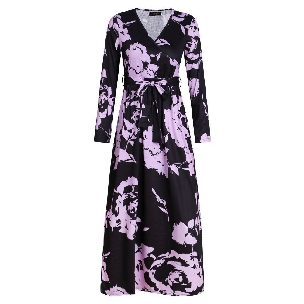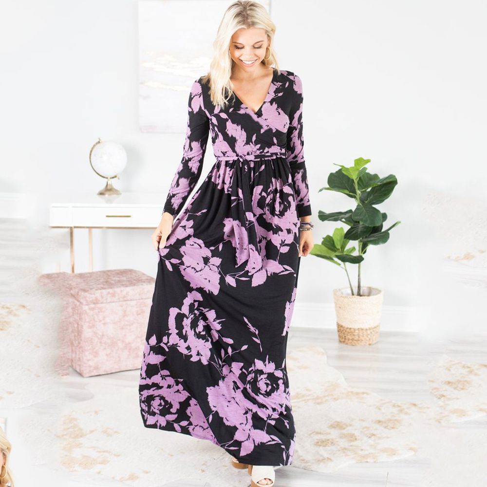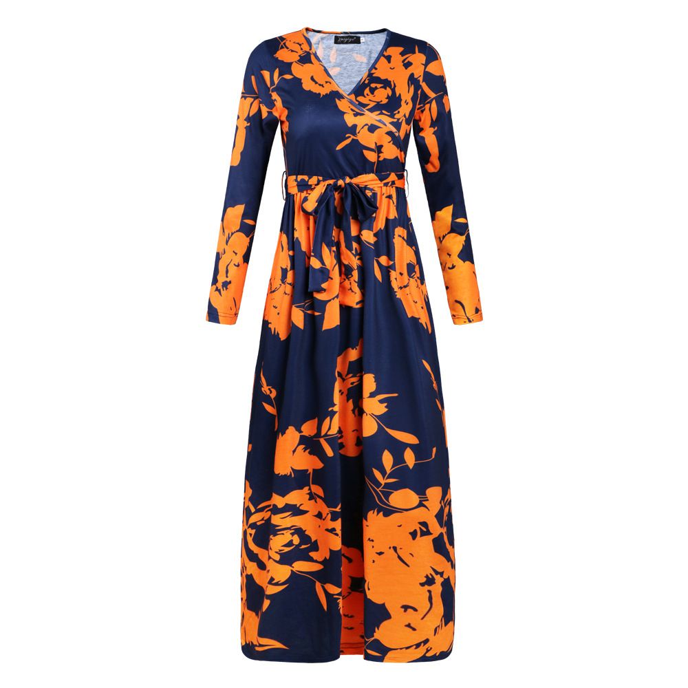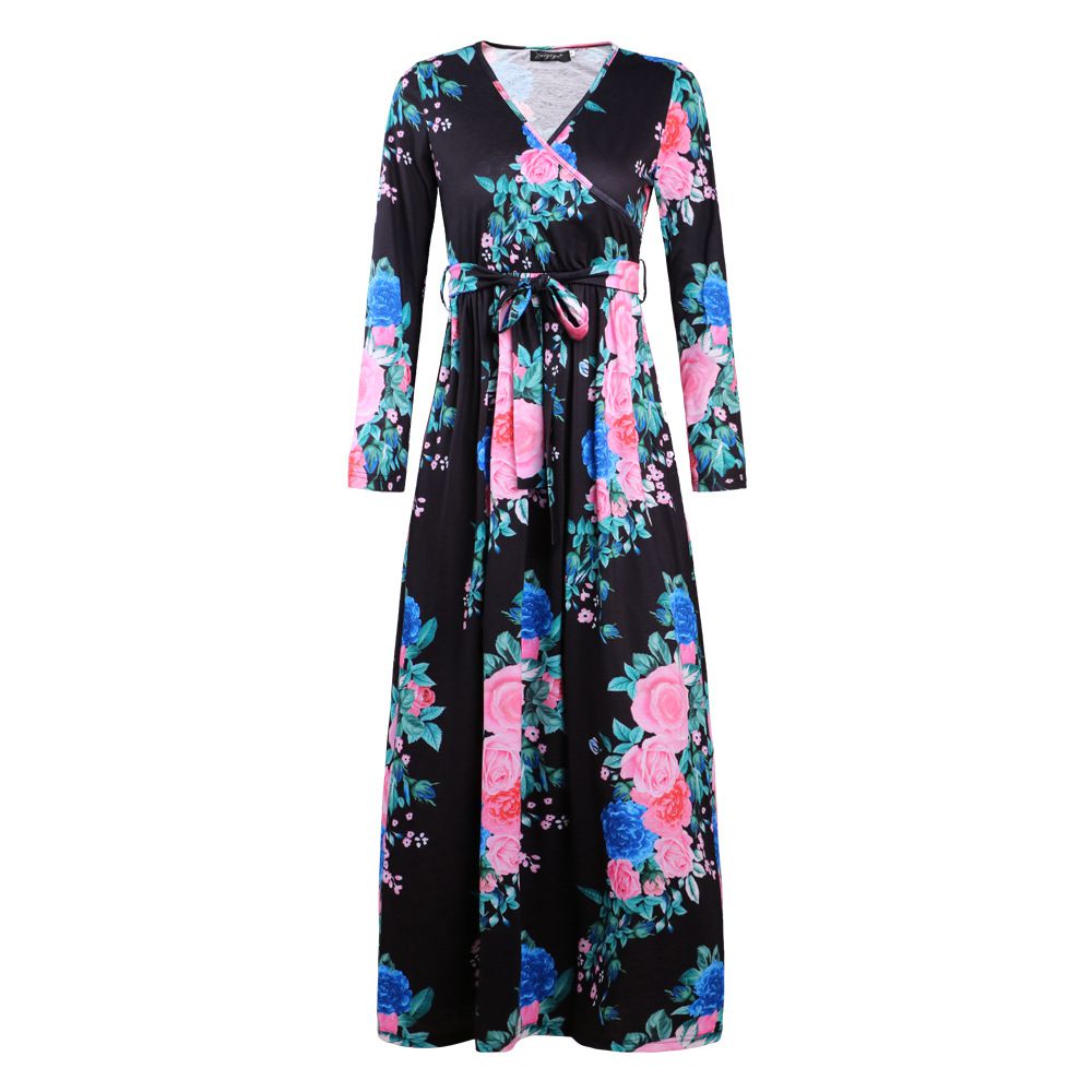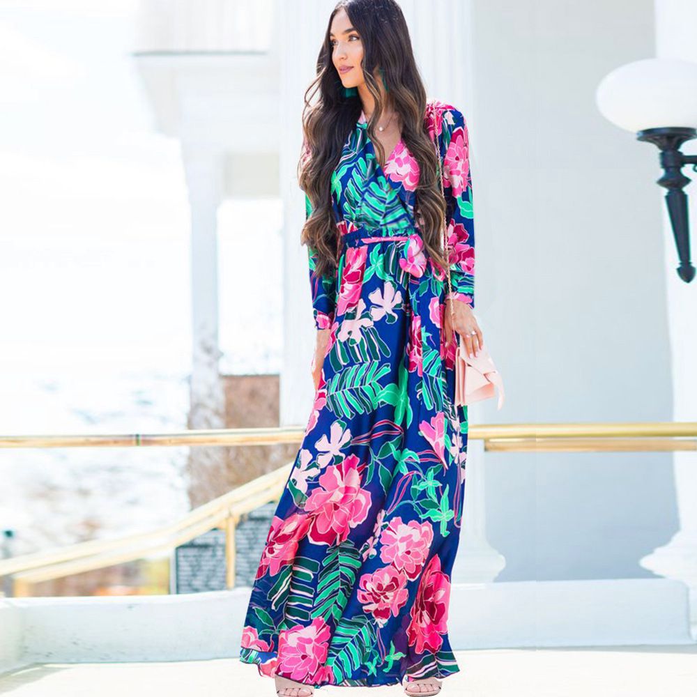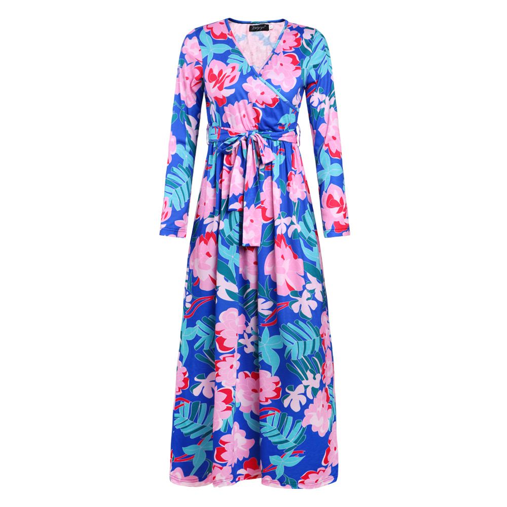 2025 autumn and winter new long skirt printing fashion v-neck long sleeve women's dress