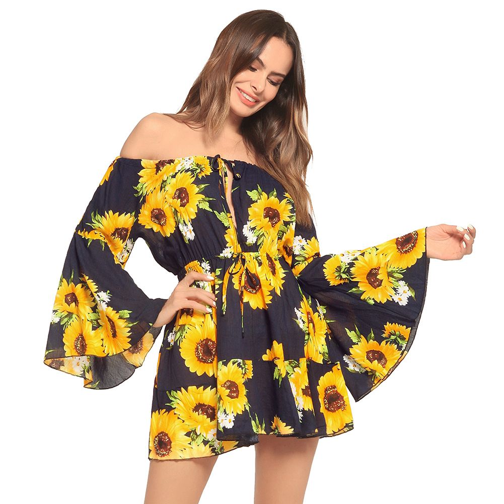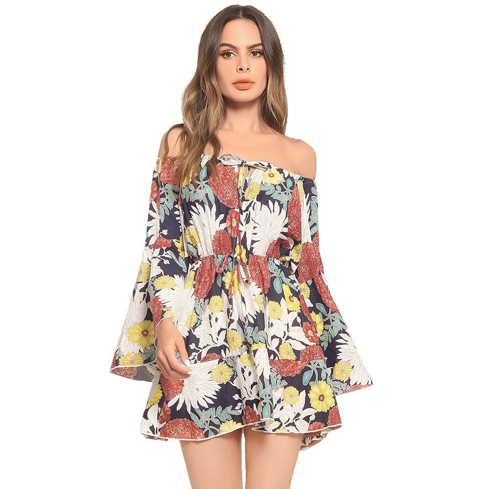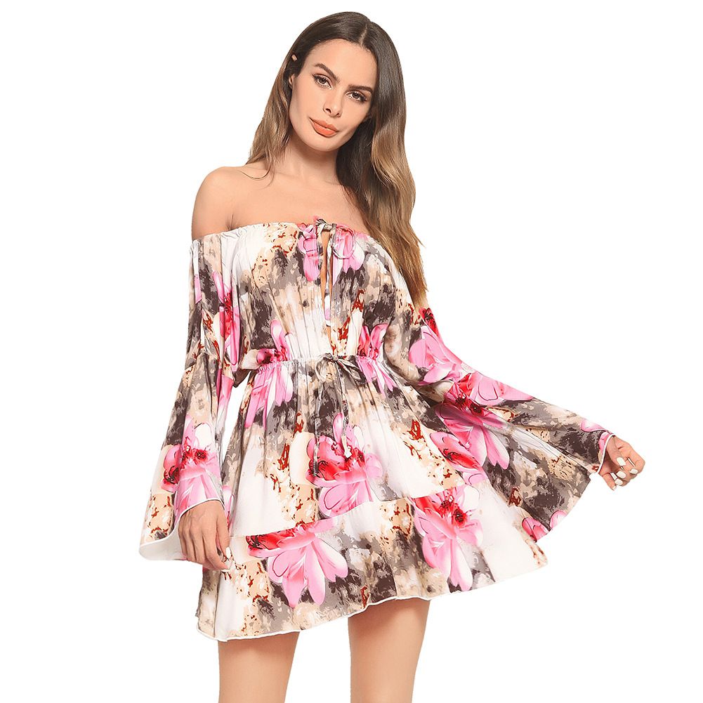 2025 new trumpet sleeve printed with a word shoulder dress short skirt holiday casual dress