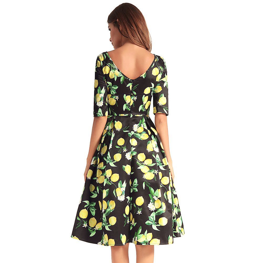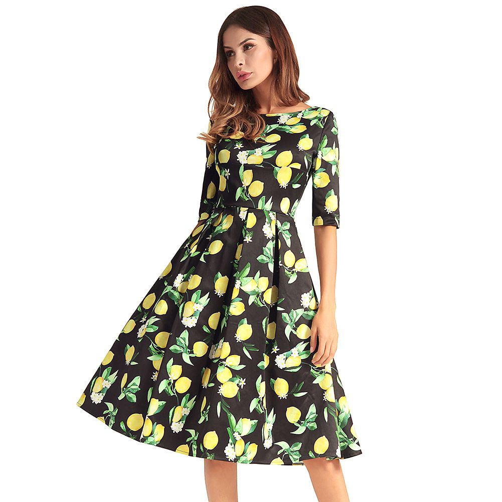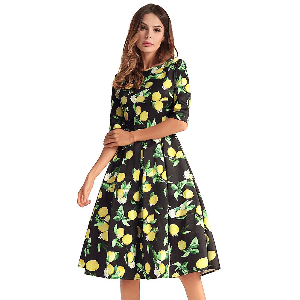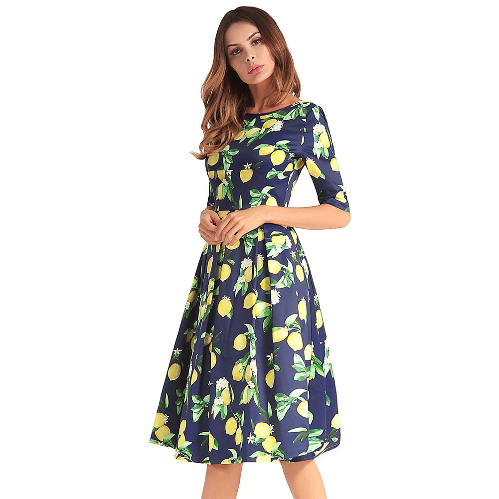 2025 spring and summer waist slimming large swing skirt sleeve printed dress