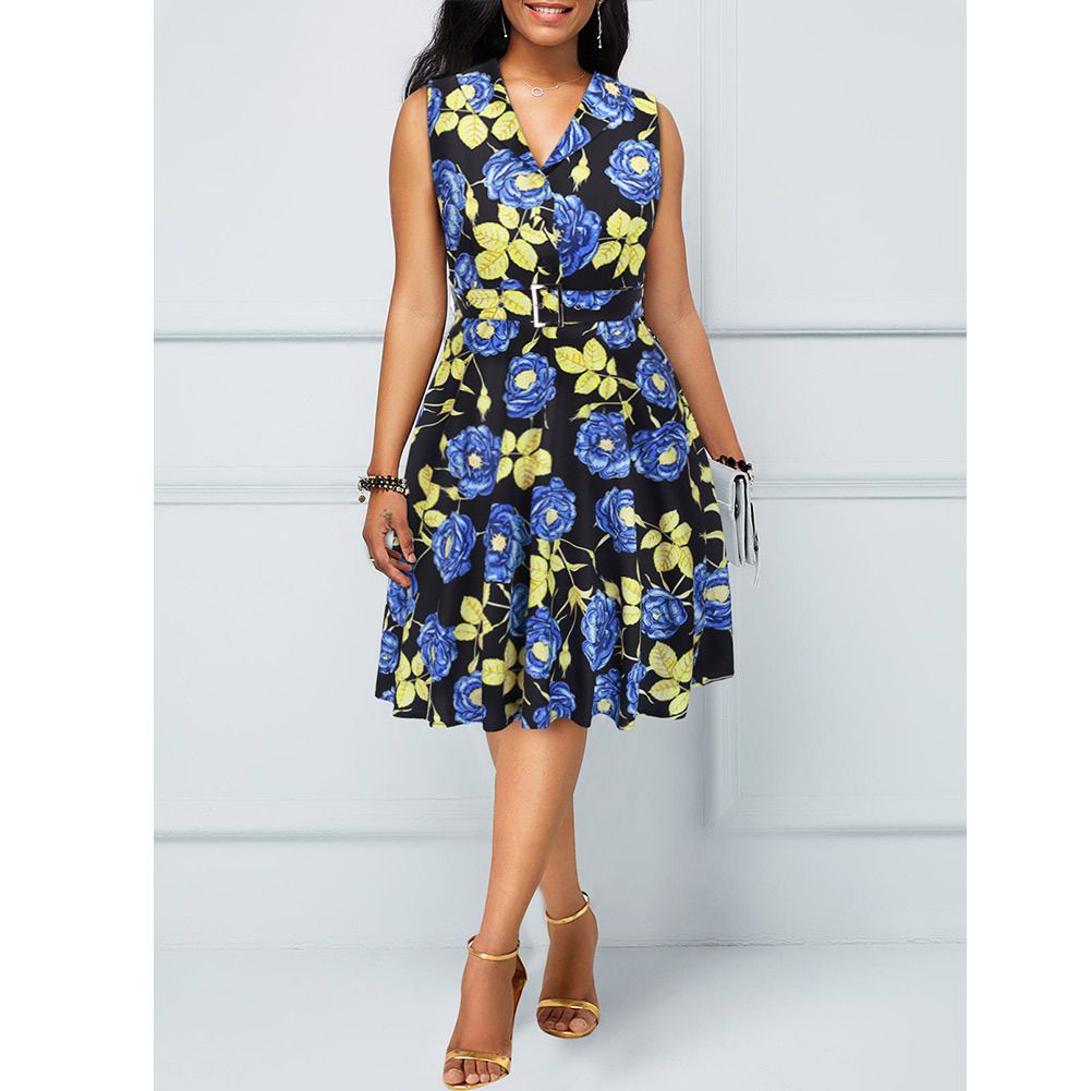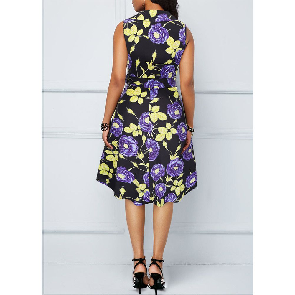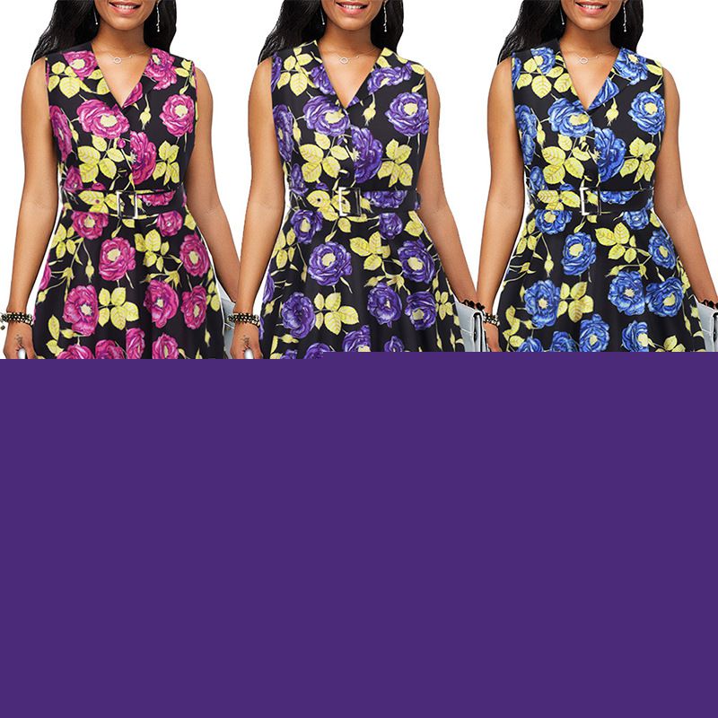 2025 spring and summer women's flower print A word skirt lapel sleeveless retro dress Hepburn wind skirt