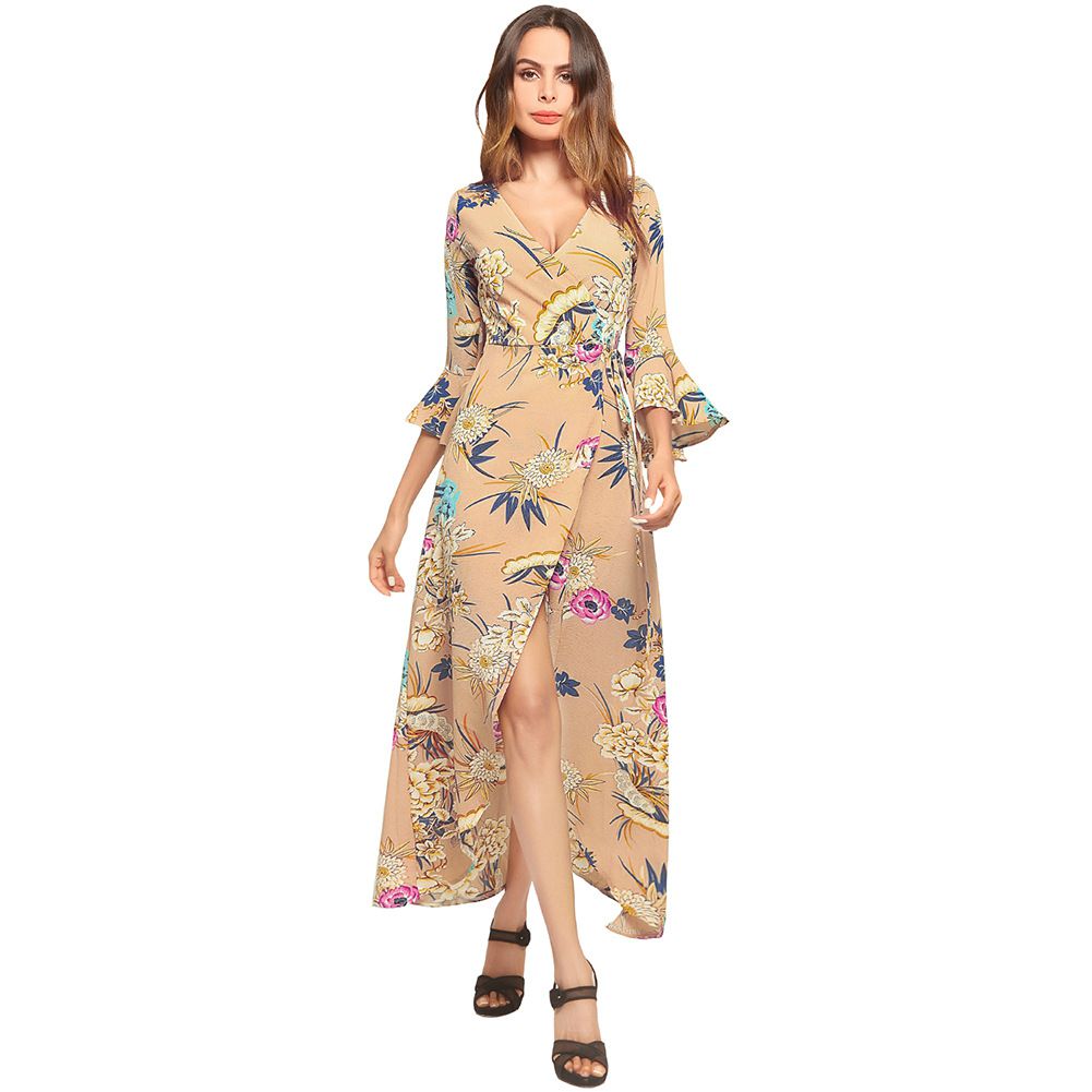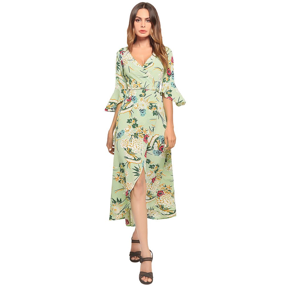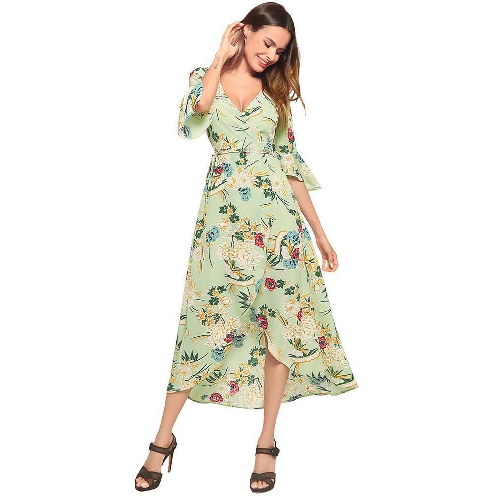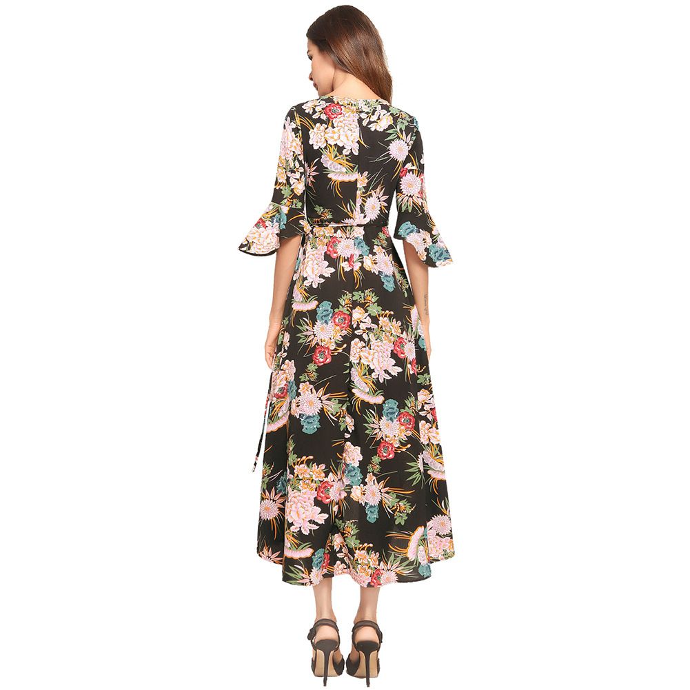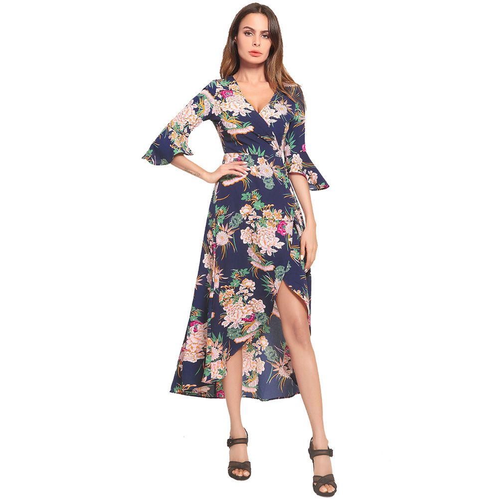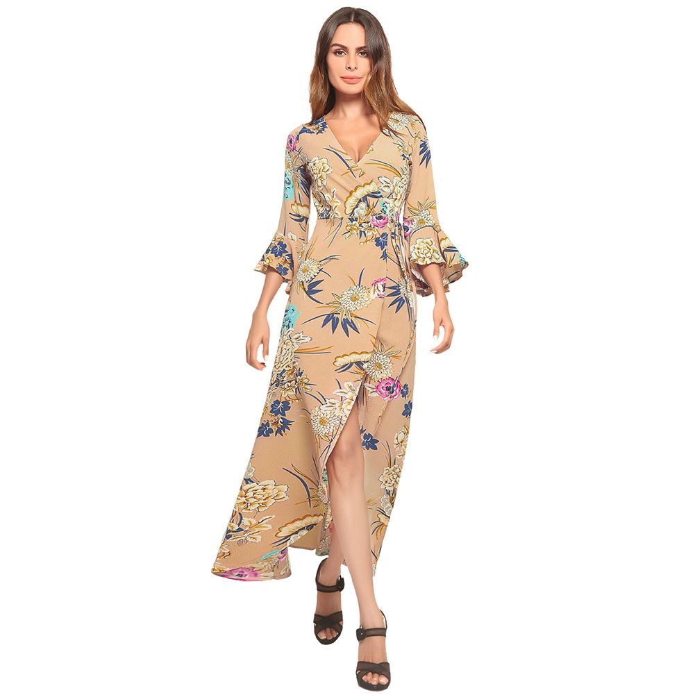 2025 summer dress V-neck flared sleeve short short long printed strap dress